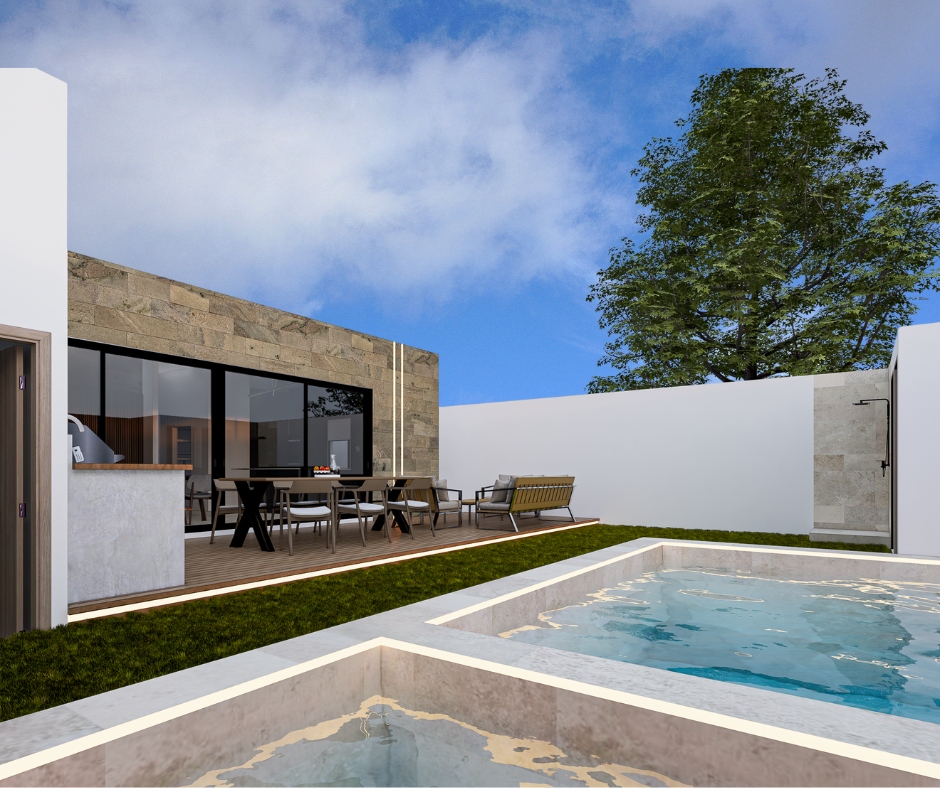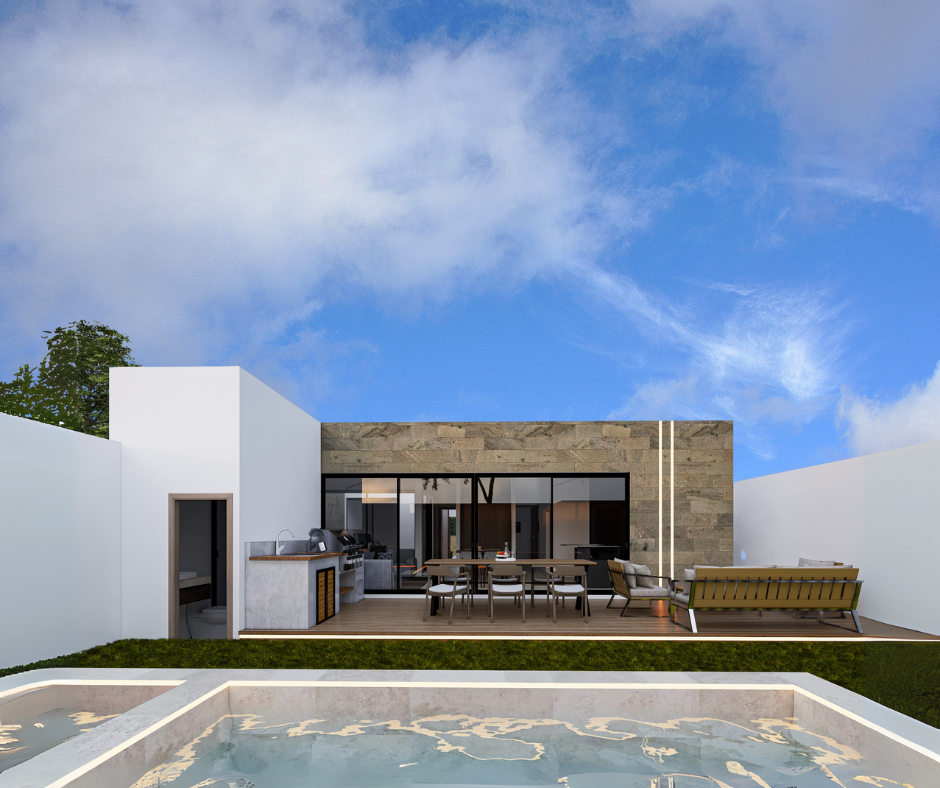 El proyecto arquitectónico incluye un patio diseñado para el disfrute y la convivencia, donde se integra una área de asador y un comedor exterior que invitan a compartir momentos memorables al aire libre.