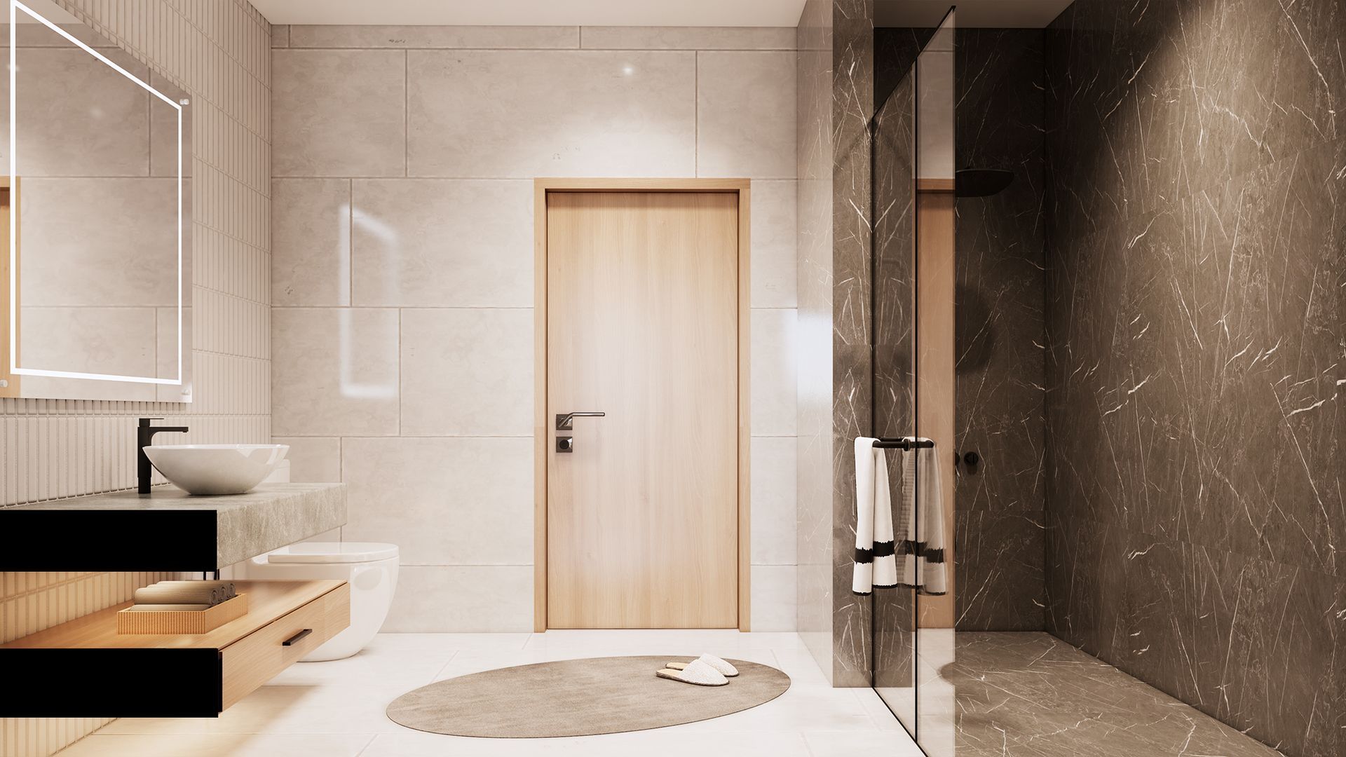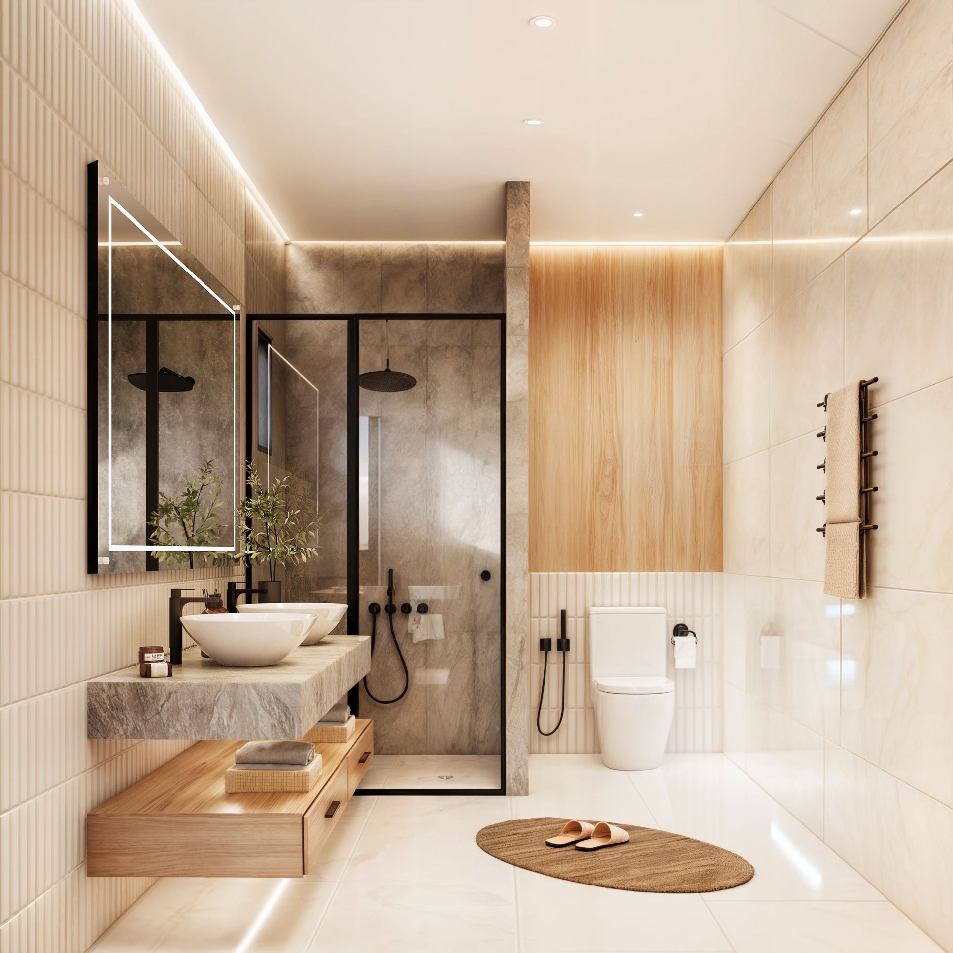 Los baños mantienen la misma estética limpia y luminosa, con un diseño que prioriza la claridad y la amplitud. Los espejos y una iluminación cuidadosamente colocada, combinada con tonos claros en paredes y muebles, potencian la sensación de frescura y orden.