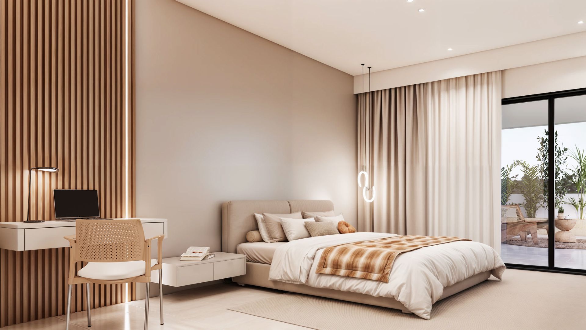 Cada una de las tres habitaciones de esta residencia ha sido diseñada bajo un mismo enfoque estético: un estilo clásico moderno que transmite calma y confort. La neutralidad en la paleta de colores se combina con acabados tipo madera que aportan textura y una sensación cálida al ambiente, logrando espacios acogedores y visualmente armoniosos.