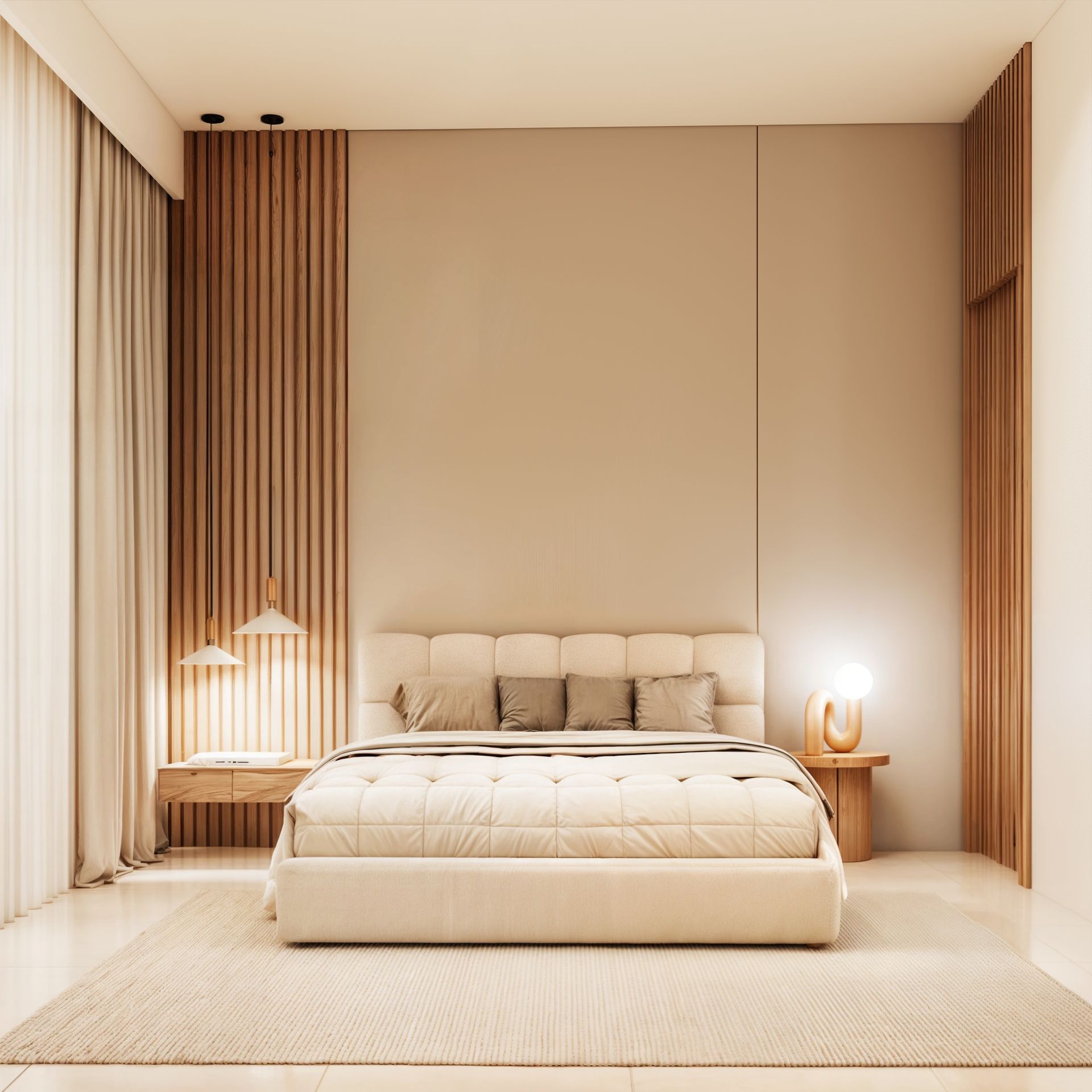 Aunque cada habitación tiene su propia distribución y carácter, todas comparten una misma esencia: bien pensada y una atmósfera serena que invita al descanso. Los tonos suaves en muros y textiles refuerzan esta sensación, mientras que los revestimientos tipo madera en muros o mobiliario aportan profundidad sin recargar el espacio.