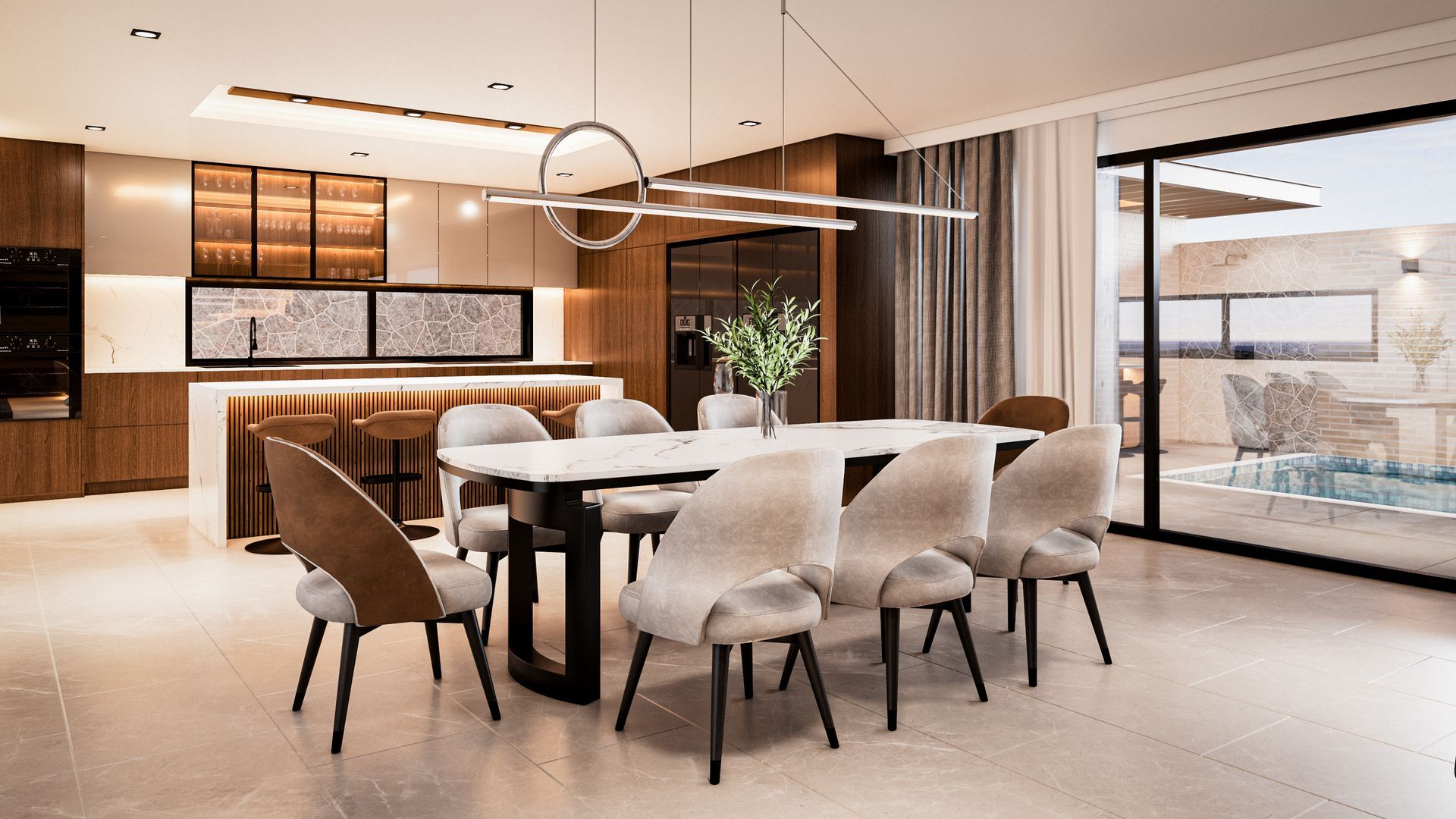 La sala y el comedor comparten un espacio amplio y luminoso, donde la iluminación en spots estratégicamente colocados resalta las texturas y volúmenes, creando atmósferas agradables tanto de día como de noche. Grandes ventanales permiten la entrada de luz natural y conectan directamente con el patio, integrando el exterior como una extensión del área social.