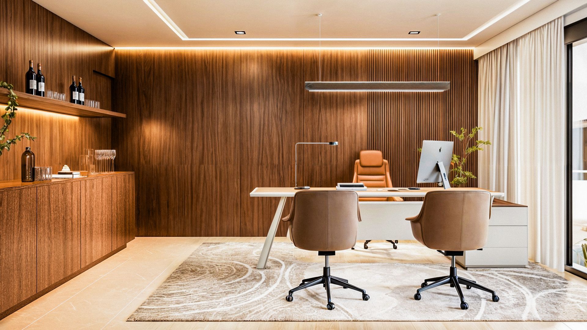 Además la sala de TV, la oficina se presenta como un área moderna y eficiente, equipada con iluminación LED que garantiza un ambiente iluminado y óptimo para el trabajo o estudio. Los acabados tipo madera aportan un toque de calidez y elegancia, equilibrando la funcionalidad con una estética sobria y contemporánea que invita a la concentración y productividad.