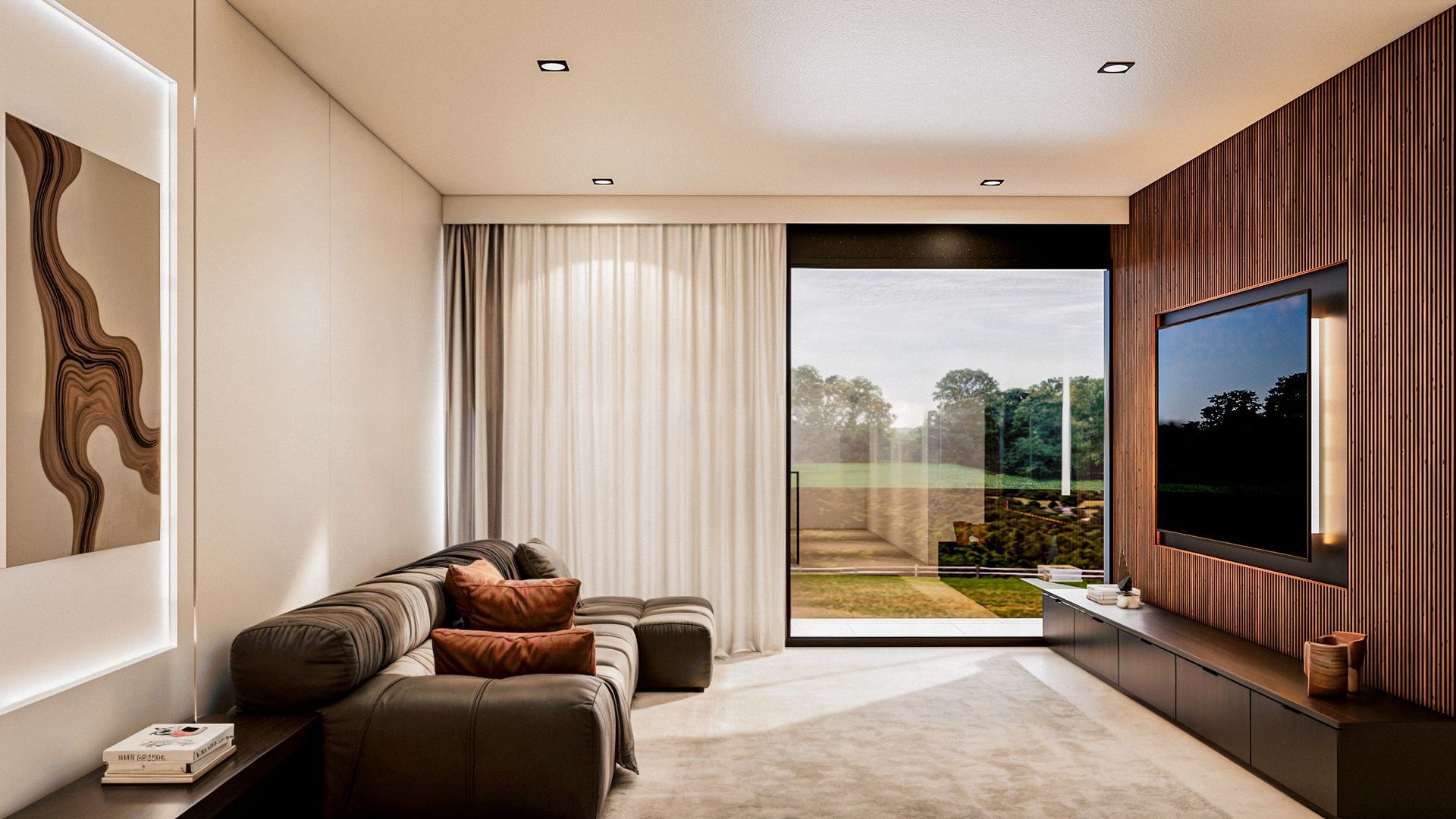 La sala de TV es un espacio diseñado para el confort y la relajación, donde la iluminación natural juega un papel fundamental gracias a un amplio ventanal que permite la entrada de luz durante el día, creando un ambiente luminoso y acogedor.