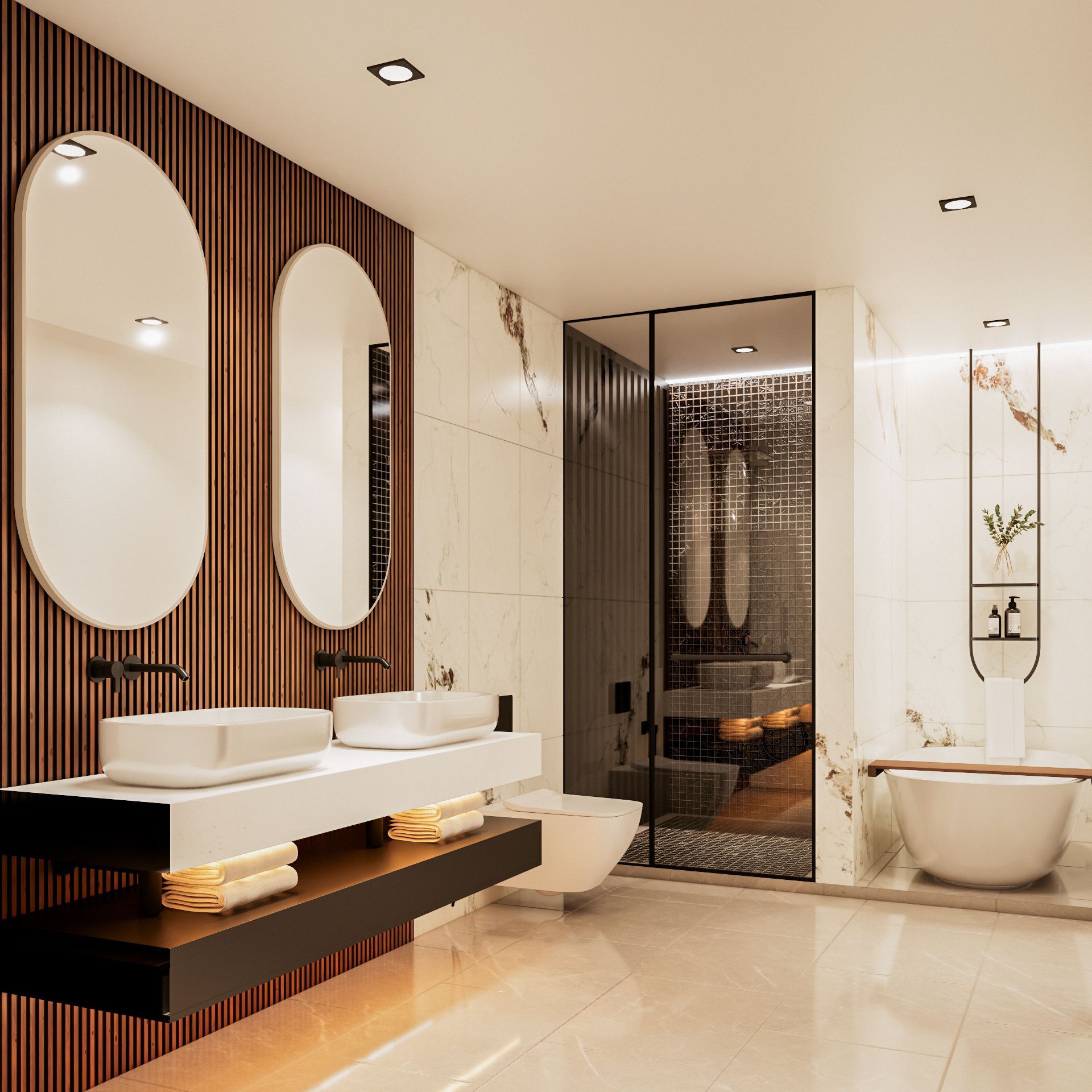 El baño, diseñado para complementar estos espacios, cuenta con un lavabo doble que maximiza la comodidad, y una regadera equipada con cancel que aporta limpieza y modernidad. Los acabados neutros y la iluminación puntual realzan cada detalle, transformando el baño en un lugar de relajación y estilo.