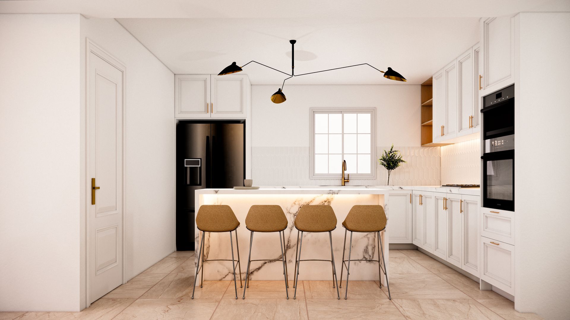 iluminación detallada resalta cada rincón, creando un ambiente acogedor y funcional, en perfecta armonía con el estilo clásico del proyecto.