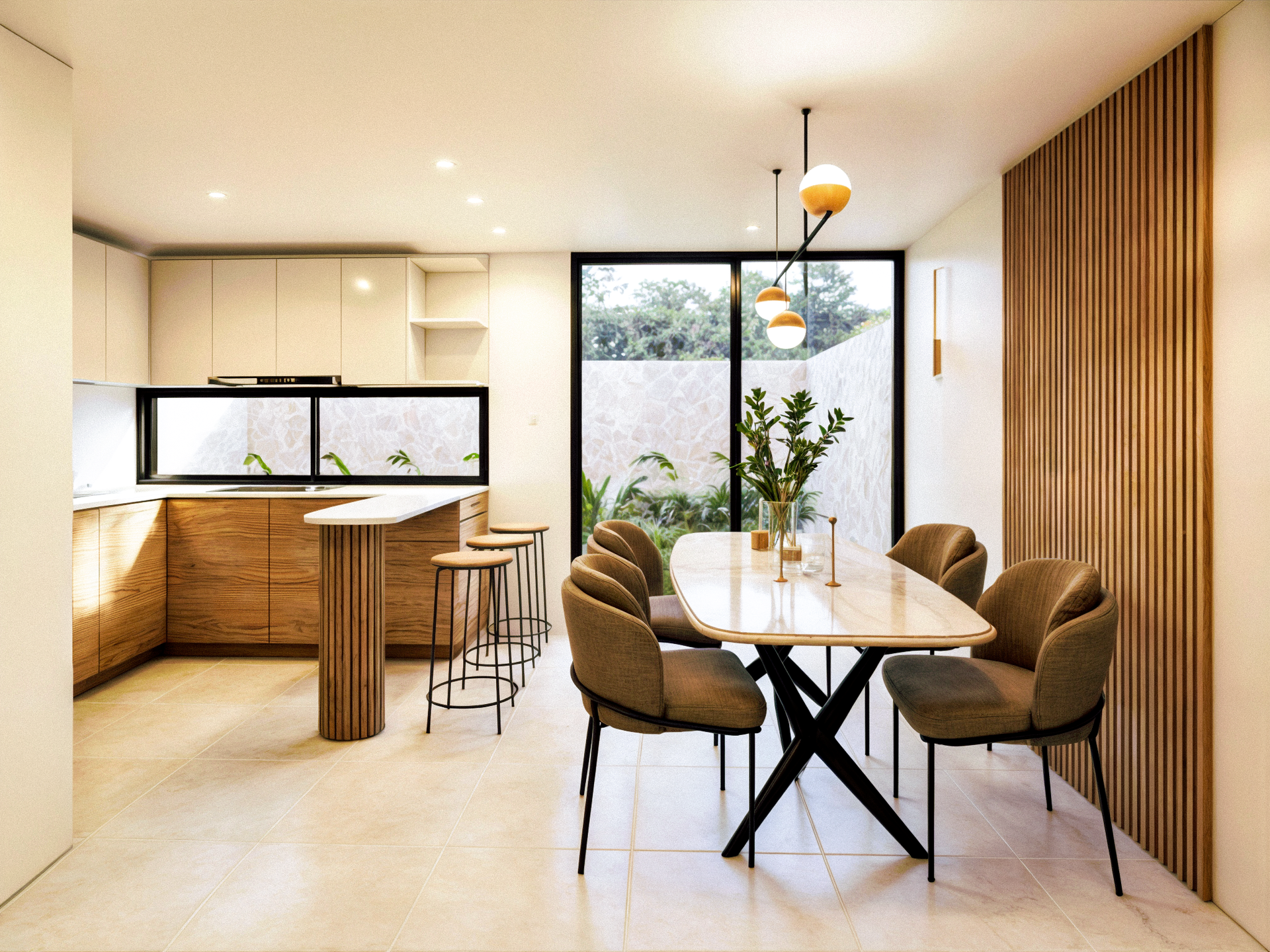 El comedor, por su parte, mantiene esta misma estética de tonos neutros y estilo clásico, con ventanales de piso a techo que proporcionan vistas panorámicas y una generosa entrada de luz natural. Los porcelanatos de acabado en madera continúan en el espacio, integrando a la perfección los elementos del interior con el exterior. El piso superior mantiene la misma estética de tonos neutros, complementado por una vegetación estratégica que aporta frescura y vitalidad. El porcelanato de madera, presente en el área, refuerza la conexión con la naturaleza, ofreciendo un ambiente cálido y sofisticado que invita al relax y la comodidad.