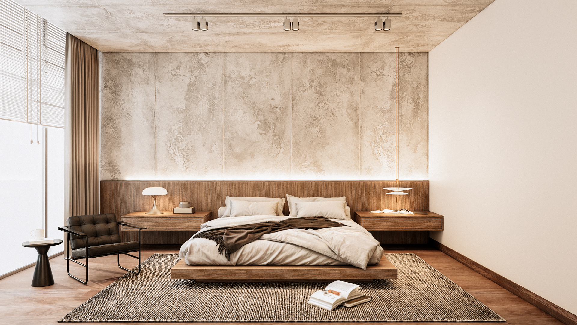Recámara con diseño brutalista y confort sofisticado