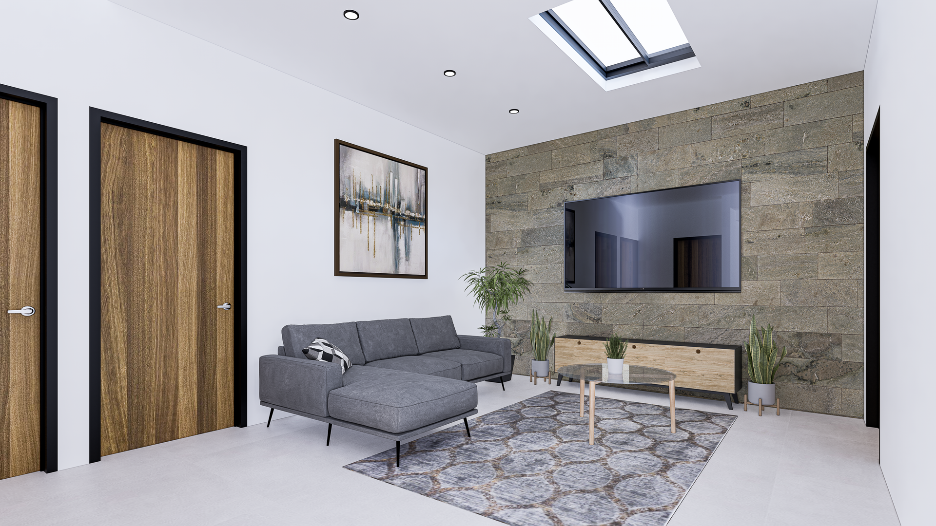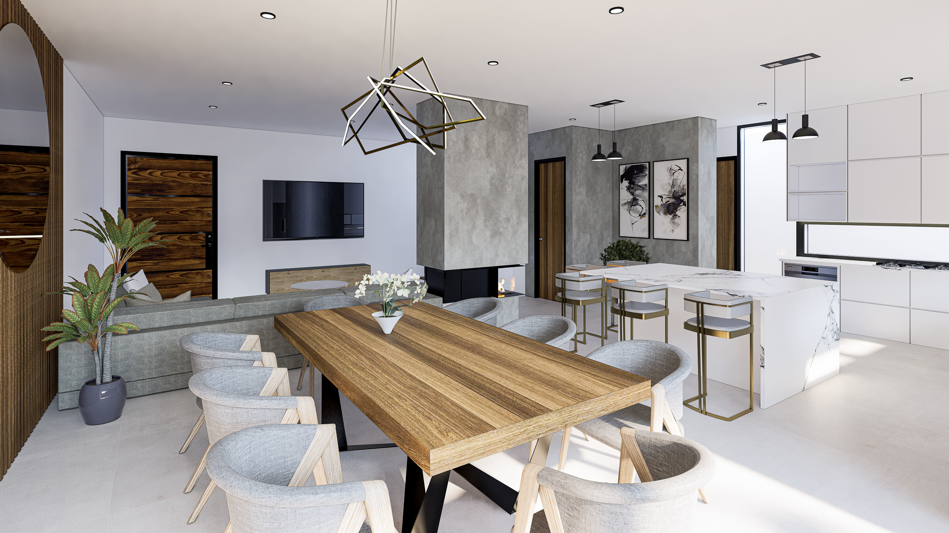 - Espacios Interiores Abiertos: El diseño interior se enfoca en la fluidez y la continuidad. Las áreas de estar, comedor y cocina están conectadas de manera abierta, fomentando la interacción y proporcionando una sensación de amplitud.